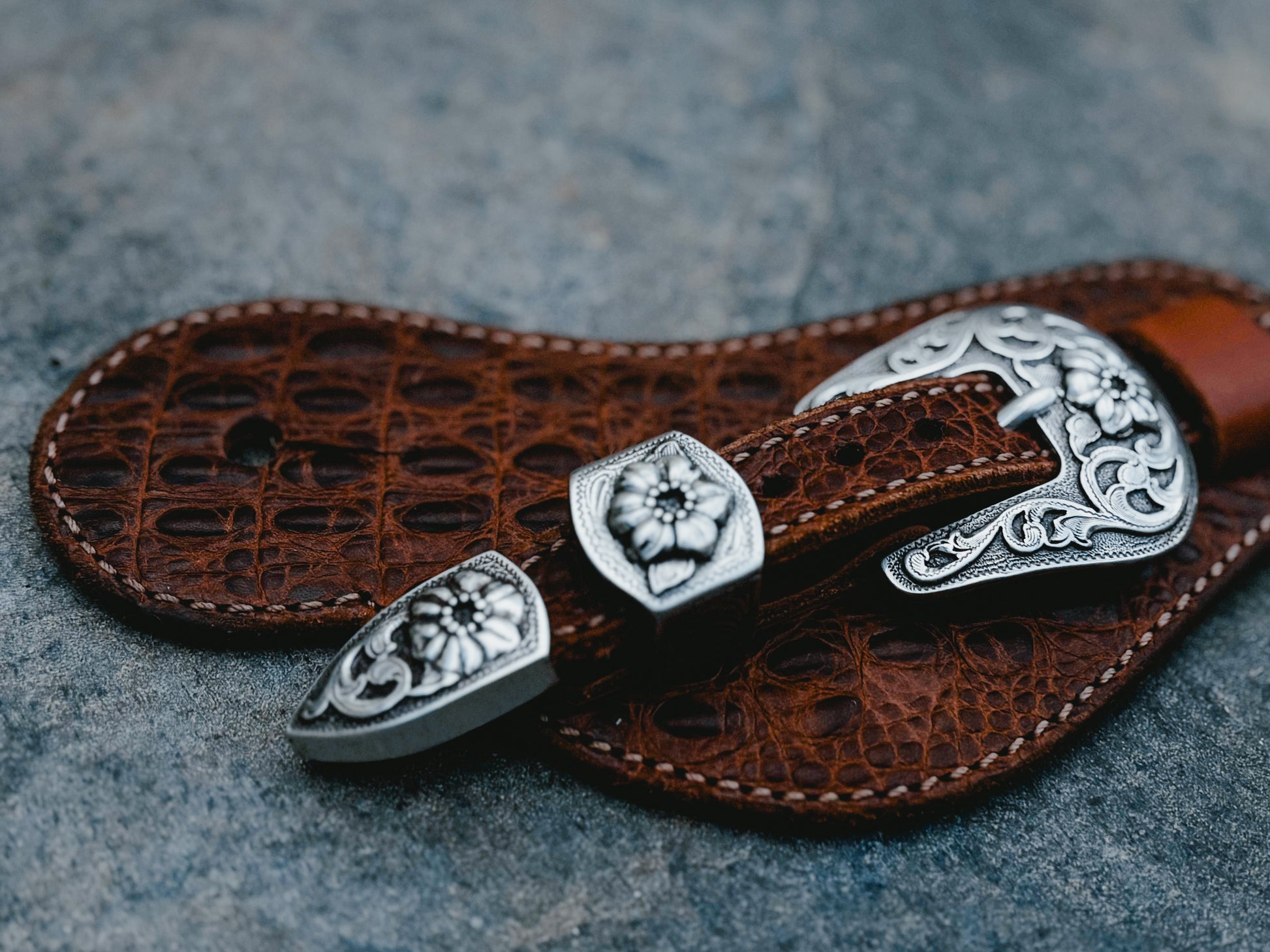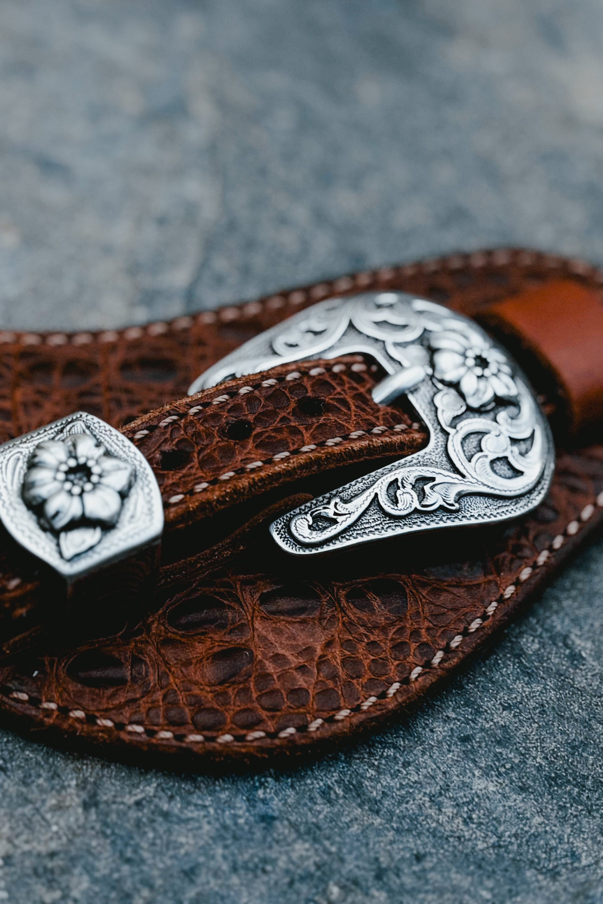 Artisanal Hardware: Finished with intricately engraved stainless steel floral buckles for a touch of timeless elegance.